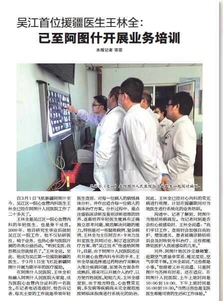 开展的各类公益活动。“听到支医,我想都没想就报名了。”王林全说。至此,他成为吴江第一位援助新疆的医生,于3月1日坐飞机赴新疆阿图什开展为期半年的医疗援助。