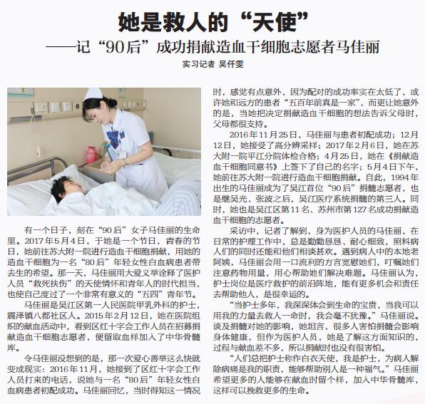 有一个日子,刻在“90后”女子马佳丽的生命里。2017年5月4日,于她是一个节日,青春的节日,她前往苏大附一院进行造血干细胞捐献,用她的造血干细胞为一名“80后”年轻女性白血病患者带去生的希望。那一天,马佳丽用大爱义举诠释了医护人员“救死扶伤”的天使情怀和青年人的时代担当,也使自己度过了一个非常有意义的“五四”青年节。
