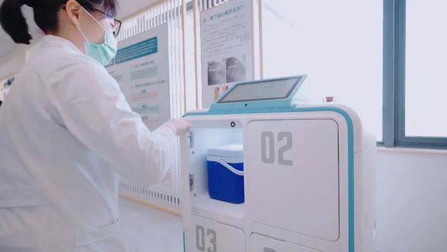 “首先刷卡解锁,然后点击配送物品,然后有四个选项对应这四个箱子,打开一号箱,把标本放进去,然后关上,点击收货地点,然后确定,装货完成它就按照我们规定的路线进行配送了。”