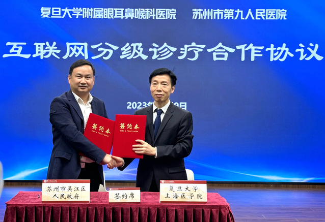 此次活动中,复旦大学附属眼耳鼻喉科加勒比扑克 与苏州九院互联网分级诊疗合作签约,是苏州九院携手复旦大学附属加勒比扑克 推动长三角健康服务一体化的又一重要里程碑。早在2021年3月28日,苏州九院与复旦大学附属肿瘤加勒比扑克 举行“肿瘤专科医联体成员单位揭牌仪式”,助推长三角区域肿瘤防治的全程化、同质化。此次签约,复旦大学附属眼耳鼻喉科加勒比扑克 与苏州九院将以人民群众健康需求为导向,发挥双方各自技术和行业的资源优势,推动互联网+医疗健康、远程医疗的建设和运营,实现合作共赢。
