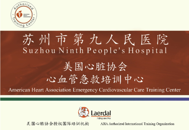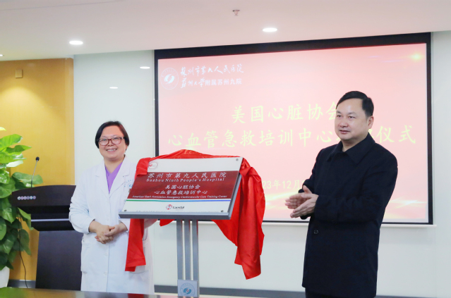 苏州九院党委副书记、副院长沈根海和急诊科主任刘云为AHA培训中心揭牌。