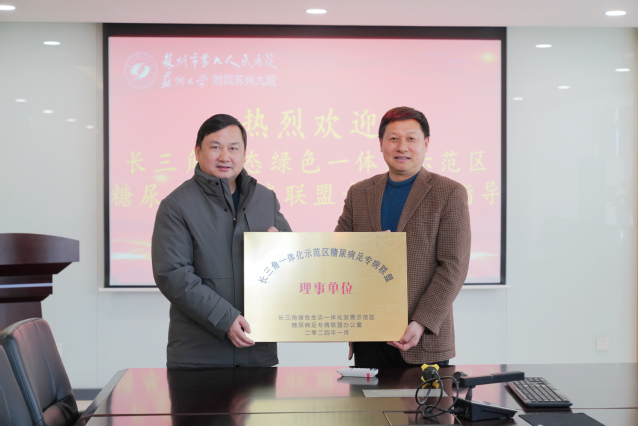 1月23日,苏州九院举行“长三角一体化示范区糖尿病足专病联盟”理事单位授牌仪式。江苏省医学会副会长胡寅,长三角一体化示范区糖尿病足专病联盟办公室主任冯卫忠,长三角一体化示范区执委会公共社发部副部长翟振宇,吴江区卫健委副主任薛建英,苏州九院党委副书记、副院长沈根海,副院长郎建华参加授牌仪式。