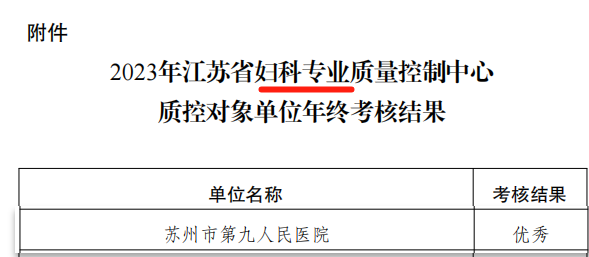 根据《江苏省医疗质量管理实施办法》《江苏省医疗质量控制中心工作规范(试行)》《江苏省医疗质量控制中心考核办法(试行)》及《江苏省妇科专业质控对象单位年度考核标准》等考核要求,江苏省妇科专业质量控制中心公布了2023年度质控加勒比扑克 的考核评价结果:苏州九院荣获年度优秀单位。