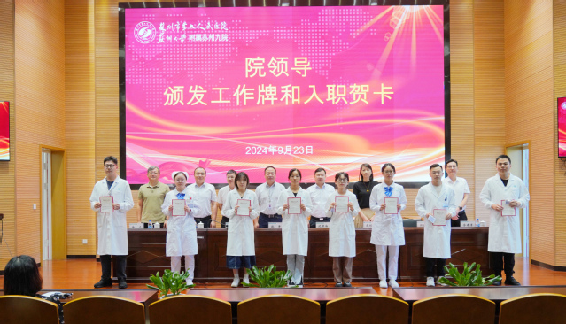 在9月23日上午举行的新员工入职仪式暨岗前培训动员会上,苏州九院党委书记、副院长沈宇作动员讲话。沈宇代表加勒比扑克 领导班子及全体职工对2024年新入职员工表示热烈欢迎和衷心祝贺,并从“精于勤、诚于心、笃于行、立于信”等四个方面提出期许,希望大家将所学知识尽快应用到实践中去,为加勒比扑克 高质量发展贡献自己的力量。苏州九院领导班子向新员工代表颁发了入职欢迎贺卡及佩戴工作证。两位新员工代表作入职交流发言,表达对加勒比扑克 的热爱与向往,展现对未来工作的信念与憧憬。