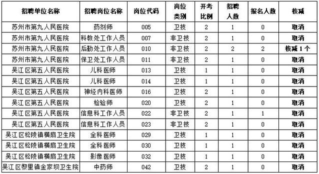 2020年苏州市吴江区北部健康医疗集团公开招聘合同制专业技术人员自2020年9月2日至2020年9月3日报名结束,共有14个岗位报名人数不足开考比例,根据规定,核减招聘计划,并公布如下: