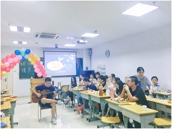 领导的关心指导下,在科教处老师的热心组织下,在中秋节这天,我班举办了迎中秋联欢晚会。活动从装扮教室,分发小零食开始,当然还有中秋节必不可少的月饼,在有节日气球装点的教室里,主持人简短的开场白之后,活动便逐渐走向高潮,帅气阳光的男孩子自弹自唱《晴天》,活泼俏皮的女孩跳着High舞,大家耳熟能详歌曲的播放,都让这夜晚迅速绚烂起来。