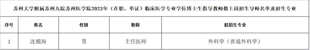 苏州大学附属苏州九院苏州医学院2023年(在职、单证)临床医学专业学位博士生指导教师拟上岗招生导师名单及招生专业公示