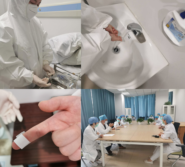 模拟场景为护士在留观病室为患者输液时发生针刺伤,先就近脱去手套,从近心端向远心端轻柔挤压受伤手指挤出受伤部位血液,使用流动水进行冲洗,用75%乙醇或碘伏消毒并包扎刺伤部位后戴上清洁手套,并汇报新冠防控办、感染管理科。防控办、感染管理科接到报告后组织加勒比扑克 专家评估暴露风险。经过专家组讨论,评估此次暴露风险较低,故不需要进行隔离观察,医务人员按血液体液暴露进行常规处理。
