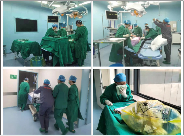 演练场景为现场模拟一手术间内突发火灾事故。手术间内巡回护士第一时间发现火情后,评估火势较大需立即停止手术,撤离病人,快速通知吧台护士请求支援。吧台护士接到支援电话后立即按下火警手动报警器,拨打火警电话汇报现场情况,并汇报科主任、护士长,同时安排推车入手术间进行病员转运。