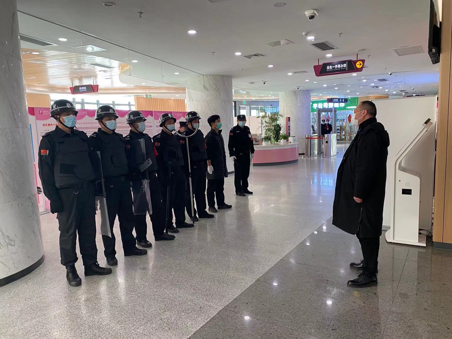 演练中,一名男子来到妇幼保健楼收费处,突然拿出包里的刀要挟工作人员交出钱款。工作人员面对突发情况沉着应对,表面详装为“歹徒”准备钱款,实则偷偷按下办公台的一键报警按钮。监控室人员收到一键报警信号,立即通知附近保安前去查看情况。附近保安抵达现场后,发现“歹徒”的意图,利用通讯设备简要讲明事件内容及地点,请求增援,并与“歹徒”保持安全距离进行周旋,通过交谈分散其注意力为救援行动拖延时间。在此期间,安保人员到位后,形成2队分别从侧门及大门进入展开救援行动。“歹徒”看到前来支援的保安队,企图逃跑,保安人员通过警棍、盾牌、防暴叉等装配及配合日常训练的防恐格斗技能,将“歹徒”成功制服,警报解除。