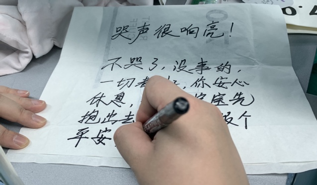 巡回护士宋千倩在护理过程中也发现沟通会有一些问题,她也不会手语,就比划着动作,产妇也能立即明白意思。她更深知,产妇在进行剖宫产手术时,只能感受到医护人员在按压,是感觉不到孩子出生的,而且这次是急诊手术,她观察到产妇比较焦虑、紧张。当医护人员成功将孩子取出时,她转身就去找纸,写下了她想对产妇说的话。