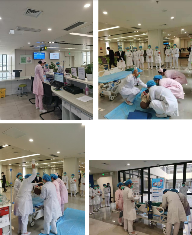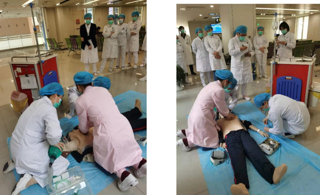 为了增强演练效果,体现工作特色,在演练前做好充分准备拟定方案,包括演练目的,参加人员,各组工作任务,演员人员病情考核要点等,事先进行了急救理论知识讲解和组织观看操作视频。演练的主要内容是:门诊二楼诊区A候诊区一患者突发倒地,意识不清,分诊护士发现后立即奔至患者身边进行就地心肺复苏,立即汇报医生处置并安全转运至急诊室。
