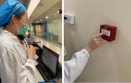 “叮叮叮"演练开始了,护士王金慧在巡视病房的时候发现垃圾桶起火了,烟雾呈蔓延状态,火势不可自行扑救,她立即通知护士胡嫣拨打加勒比扑克 火警内线电话5911,同时拨打外线火警电话119进行报警,胡嫣护士打完电话之后一路小跑启动了手动火警报警装置,一瞬间警铃响彻病房,随后立刻通知所有上班的医务人员火情的发生,同时报告护士长及科主任。