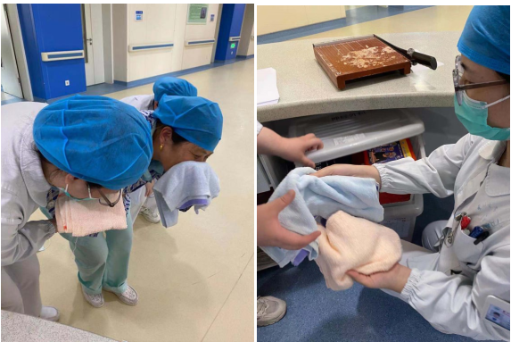 与此同时护士许佳佳和王晗婷听到呼救声,立刻跑到病房向患者说明情况并稳定患者及家属的情绪,有序地组织疏散患者及家属人员,指导患者及家属用湿毛巾或者湿衣物捂住口鼻,弯腰俯身,协助患者及家属离开危险区,向两侧安全通道撤离。切忌火灾发生时不可乘坐电梯,如果两侧安全门被浓烟封住,则往上层疏散。