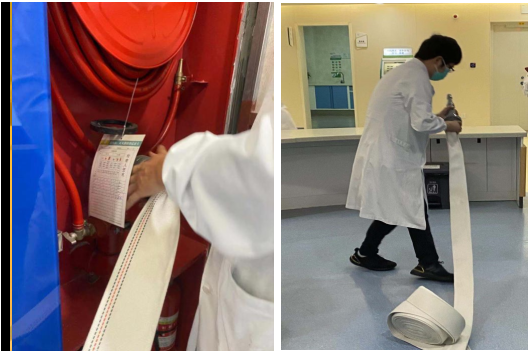 医生钱伟、刘星听到呼救声,立刻从办公室起身赶往起火处,打开距离火源最近的消防栓,只见他们熟练的展开水带,水带一头连接连接消防栓接口,一头连接水枪。他们在火苗的上风口将水枪对准火苗根部,打开水阀开关,喷射出水。