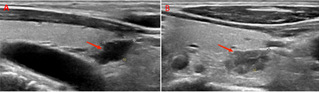 △甲状旁腺B超图:A、B(纵切面)分别提示甲状腺右侧叶下极下方、甲状腺左侧叶下极背侧增生甲状旁腺组织(红色箭头所示)