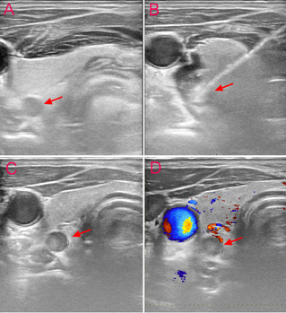△甲状腺左叶下极背侧功能亢进甲状旁腺微波消融术图:A、消融前超声;B、消融中实时超声监测;C+D、消融后超声+CDFI,提示该甲状旁腺组织消融后回声增高、无血流。(箭头所示为甲状旁腺)