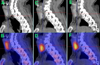 △99mTc-MIBI甲状旁腺显像图:A+B、C+D、E+F(矢状位CT+SPECT/CT融合显像)分别提示甲状腺右叶下极下方、甲状腺左叶上极背侧、甲状腺左叶下极背侧功能亢进甲状旁腺组织(十字线交叉处)