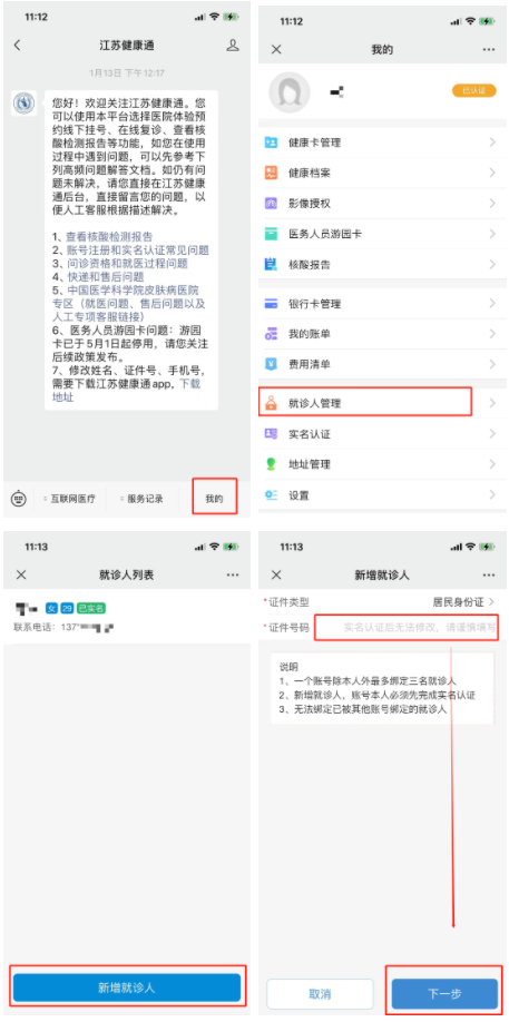 3.儿童或老人不会用互联网的,监护人可协助就诊,监护人注册并实名认证后,在江苏健康通——我的——就诊人管理中添加儿童或老人为就诊人,就诊时,选择对应的需要就诊的患者即可