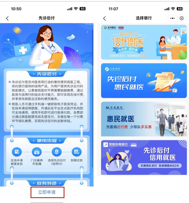 2.使用“先诊后付”功能,需先申请注册。选择“立即申请”,目前有四家银行支持“先诊后付”功能,患者可选择其中一家银行,注册绑定后,即可享受信用支付。