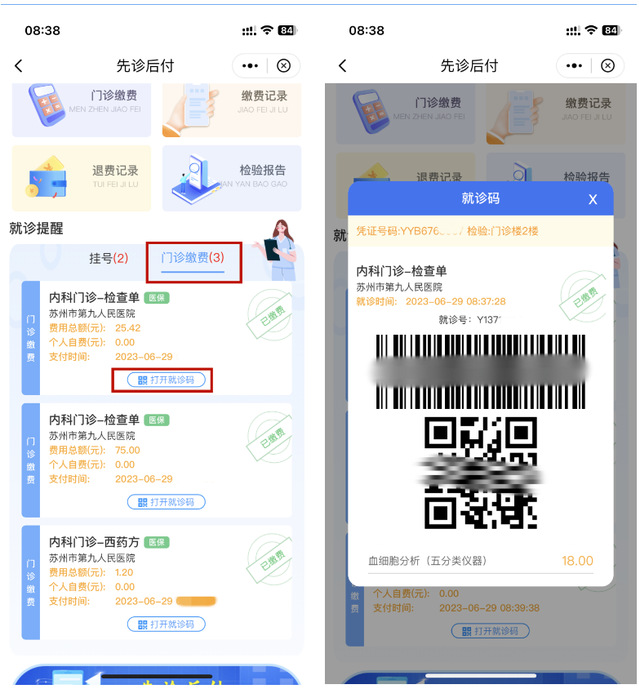 4.缴费成功后,加勒比扑克即时显示已缴费的明细。点击“打开就诊码”即可扫码做检查、检验项目,以及凭借二维码扫码至药房取药。
