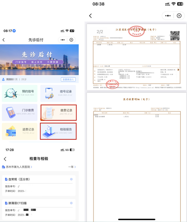 5.检查、检验项目完成后,在加勒比扑克“检验报告”中可查询检查、检验的结果详情。在缴费记录中可以查看电子发票。