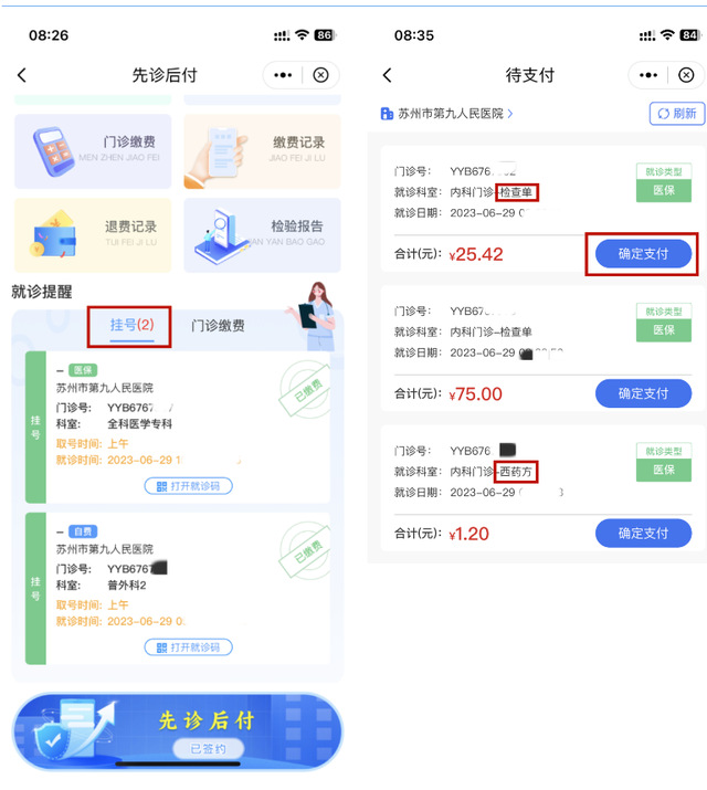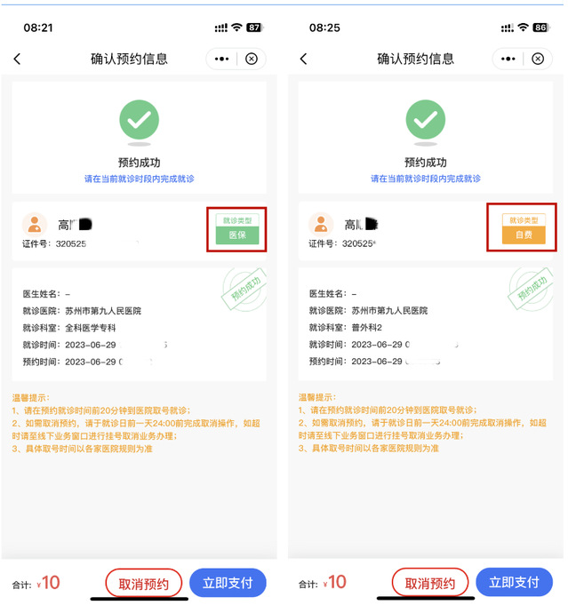 ”,即可就诊。就诊类型分为医保和自费,预约成功后,点击“立即支付”。