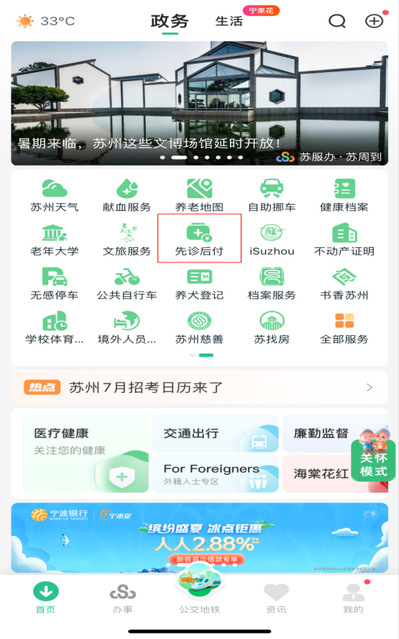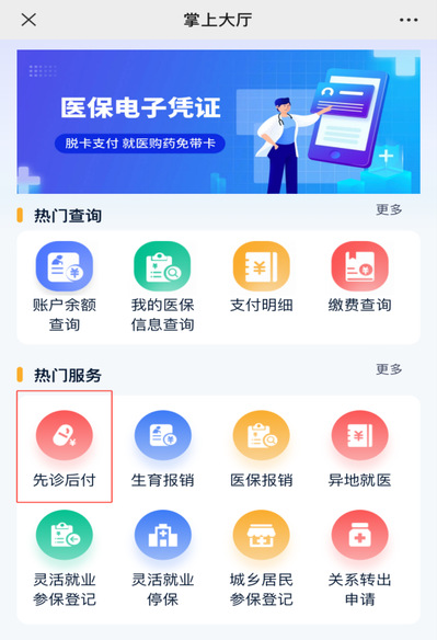 1、进入苏州医保公众号——点击掌上大厅——点击“先诊疗后付费”或者苏周到app点击“先诊后付”