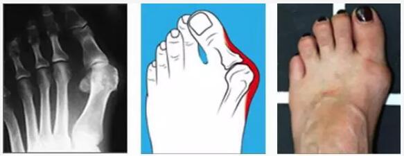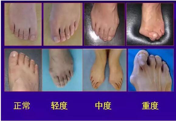3、重度:拇外翻超过40°,拇趾外翻明显,同时伴有旋转,与第二趾重叠,产生交叉趾畸形,足底老茧明显伴有疼痛,穿鞋及行走影响明显,部分可出现膝关节疼痛、腰酸背痛等。