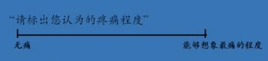 目测模拟法划一长线,一端代表无痛,另一端代表剧痛,让患者在线上的最能反映自己疼痛之处划一交叉线。由评估者根据划叉的位置,测算其疼痛程度。