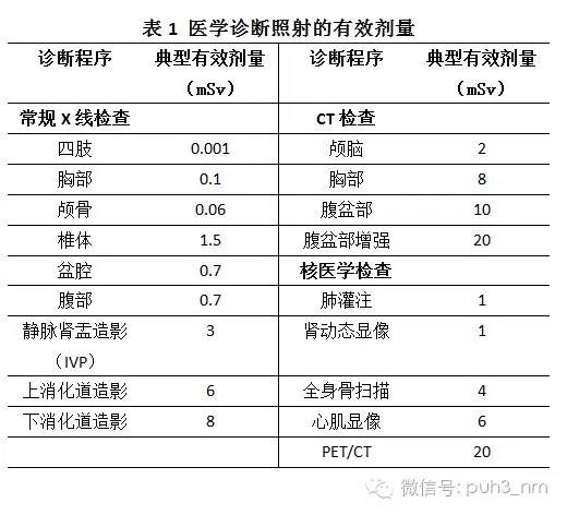 以核医学最常用的核素99mTc为例,其半衰期6小时。注入患者体内后随着时间会很快的衰减,同时加上药物从体内的代谢和排泄,一般在患者体内的有效半衰期最多为2-3个小时。以使用核素量较大的骨显像为例,常规注射量25mci,辐射剂量约为4.2mSv,明显低于常规胸部CT平扫的剂量(表1,数据来源于中华医学会核医学分会)。同时由于放射性药物具有很高的生物学探测灵敏度,与CT或MR造影剂相比,所需化学量很少,不干扰破坏体内生理过程的平衡状态,通常没有过敏反应。注射核素显像剂以后,不会干扰其他影像检查(如超声、CT、MR等)。因此,在专业核医学医师的指引下,患者可以放心接受核医学诊疗。