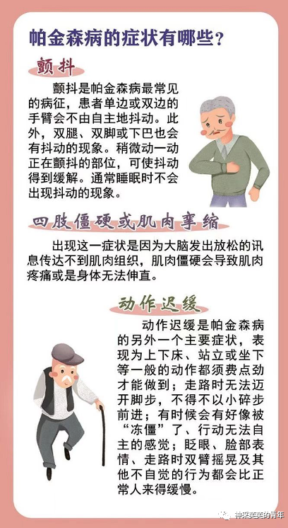 帕金森病主要发生于中老年人,偶有30岁以下发病者。隐匿起病,缓慢进展,震颤“N”起病,一侧上肢至同侧下肢,再对侧上肢,对侧下肢发展,少数可无震颤。患者随意动作减少,动作缓慢、笨拙,可出现面具脸(面容呆板,双眼凝视,眨眼减少),写字过小征,易跌跤,前冲步态。帕金森病还有些非运动症状:便秘、出汗异常、性功能减退和溢脂性皮炎(脂颜)、流涎、近半患者伴有抑郁和(或)睡眠障碍,早期可有嗅觉减退,晚期可发生痴呆。常规血检查均无异常。CT、MRI检查亦无特征性改变,或脑室扩大、脑萎缩。功能性脑影象PET或SPECT检查有辅助诊断价值。