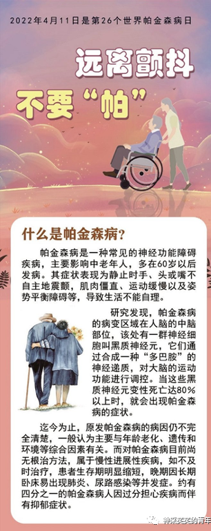 4月11日是第26个世界帕金森病日。帕金森病(Parkinson’s disease, PD)又名震颤麻痹,是一种常见于中老年的神经变性疾病,临床上以静止性震颤、运动迟缓、肌强直和姿势步态障碍为主要特征。有环境因素、遗传因素、生理老化交互作用。