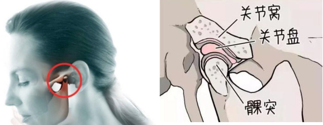 颞下颌关节(TMJ),是头部**可动的关节,下面左图是该关节在面颊部的位置,右图是局部放大后的关节简化图。