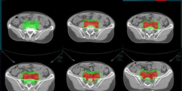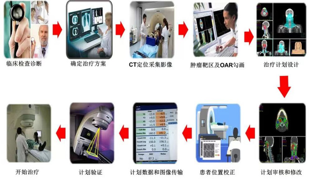 放疗医生在模拟定位过程获得的CT图像上逐层(30-80层)勾画患者的肿瘤及需要照射的区域,同时还需要勾画出需要保护的正常器官(10-30种)。靶区的确定和放疗剂量、照射次数都有关系,还需要考虑到正常器官。