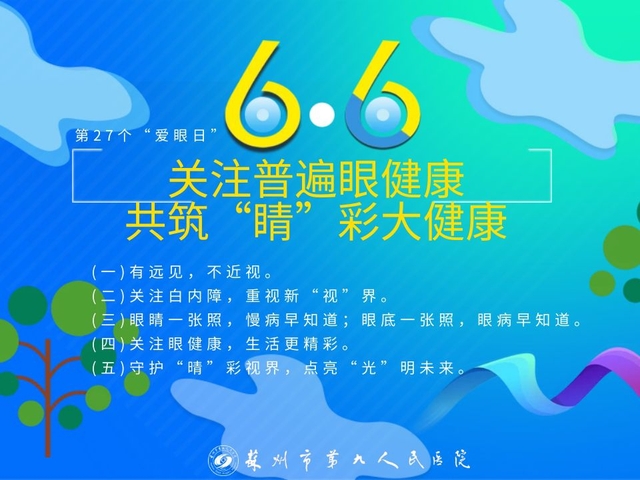 眼健康是国民健康的重要组成部分,涉及全年龄段人群的全生命周期。通过持续不断的努力,人民群众眼健康水平不断提高。6月6日,我们迎来了第27个“眼日”,今年的宣传主题为:关注普遍眼健康,共筑“睛”彩大健康。苏州九院眼科开展了一系列的活动,进一步增强了广大群众爱眼、护眼的意识,对防盲、治盲工作起到了积极的推动作用。