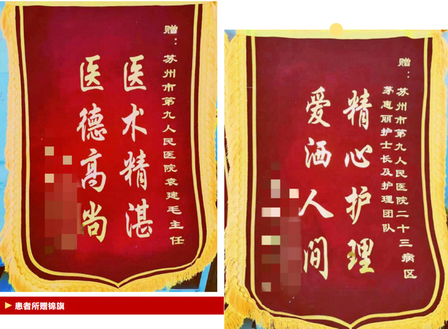 近日,苏州九院肝胆胰脾外科23病区袁建毛主任、茅惠丽护士长医护团队收到了两面锦旗,分别写着“医术精湛,医德高尚”“精心护理,爱洒人间”。锦旗来自于一位80岁的高龄患者。