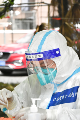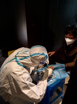 “我是党员我留下,让其他组员先休整。”我选择积极响应党的号召,在隔离点连续工作一个月后留下来继续战斗。作为隔离点医护组的组长,主要承担每日动态制定采样任务、数据的上报、常规医疗服务、阳性人员转运、指导工作人员个人防护等工作,为隔离人员换药、拆线,评估病情、指导用药,转运阳性人员。