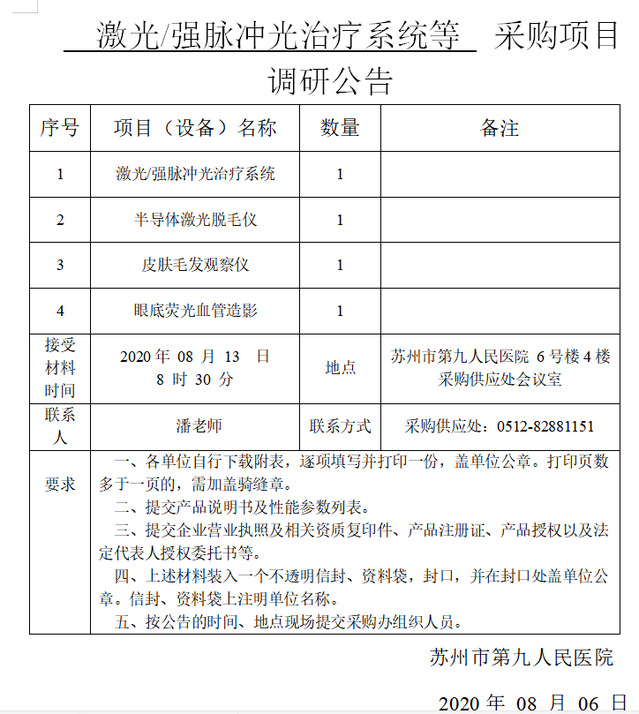 激光/强脉冲光治疗系统等采购项目调研公告