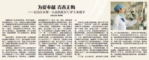 当年考上无锡卫校的时候,她对于护士的理解仅止于“白衣天使”这四个字。直到她面对躺在床上的病患时,才真正意识到什么是护理——吸痰、擦身、处理大小便……各种脏与累。尤其进入ICU后,时刻面对着昏迷且不能自理的病患,还有各种血肉模糊的伤口,那种感觉对于一个花季少女来说,真的很难表达。不过,善良的朱悦宇适应得很快,秉持耐心细致专业的态度,她赢得了许多病人的称赞。ICU里有个住了很长时间的病人,因为插管口不能言,对于护士的护理技能要求很高,稍不如意就发火。为了能准确理解病人的意思,朱悦宇调整好心态,不断向同事请教,努力意会病人的需求,现在她已经能够处理得非常得心应手了。病人和家属也常常向她表达感谢之意。