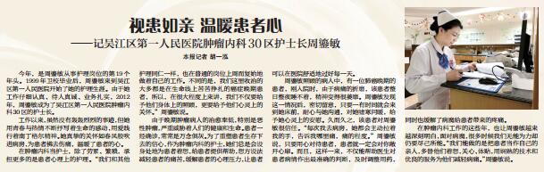 周鎏敏照顾的病人中,有一位肺癌晚期的患者,刚入院时,由于病痛的折磨,该患者整日整夜睡不着,精神变得很萎靡。周鎏敏发现这一情况后,密切留意,只要一有时间就会来到她床前,耐心与她沟通,对她嘘寒问暖,给予她心灵上的安慰。久而久之,该患者对周鎏敏很信任。“每次我去病房,她都会主动拉着我的手,告诉我哪里痛,痛的程度。”周鎏敏说,只要用心对待患者,患者就一定会对你敞开心扉。而且,这样一来,不仅能帮助医生对患者病情作出最准确的判断,及时调整用药,同时也缓解了病魔给患者带来的疼痛。