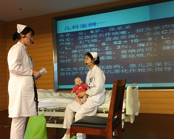 护理部预先挑选了15个具有各科代表性的床边案例进行参赛。选手们准备充分,自信满满。自带模拟病人,在舞台上以护士角色对病人热情、主动地进行床边宣教,将学到的知识运用到具体的案例中。观看的实习生也是看得津津有味。