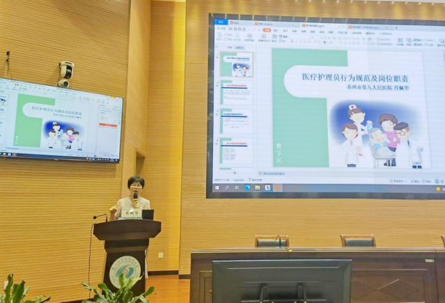 苏州九院护理部主任肖佩华希望学员们以本次培训为契机,坚持“以患者为中心”的服务宗旨,通过系统化、专业化培训,不断提升综合职业素养和专业能力,树立良好的职业形象,为患者提供安全、优质、有温度的服务。肖佩华为学员们开启了培训班第一讲,主题是《医疗护理员行为规范和岗位职责》。