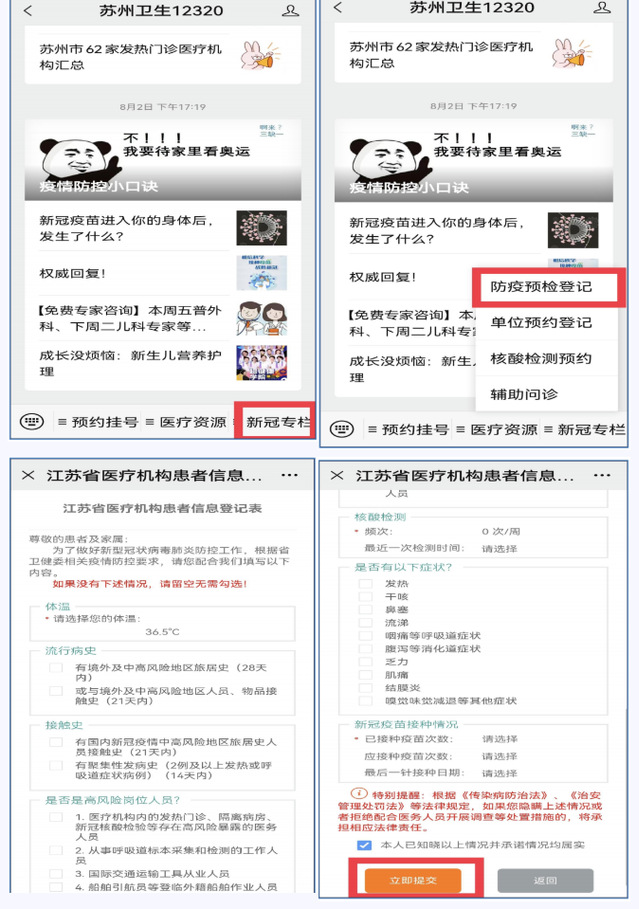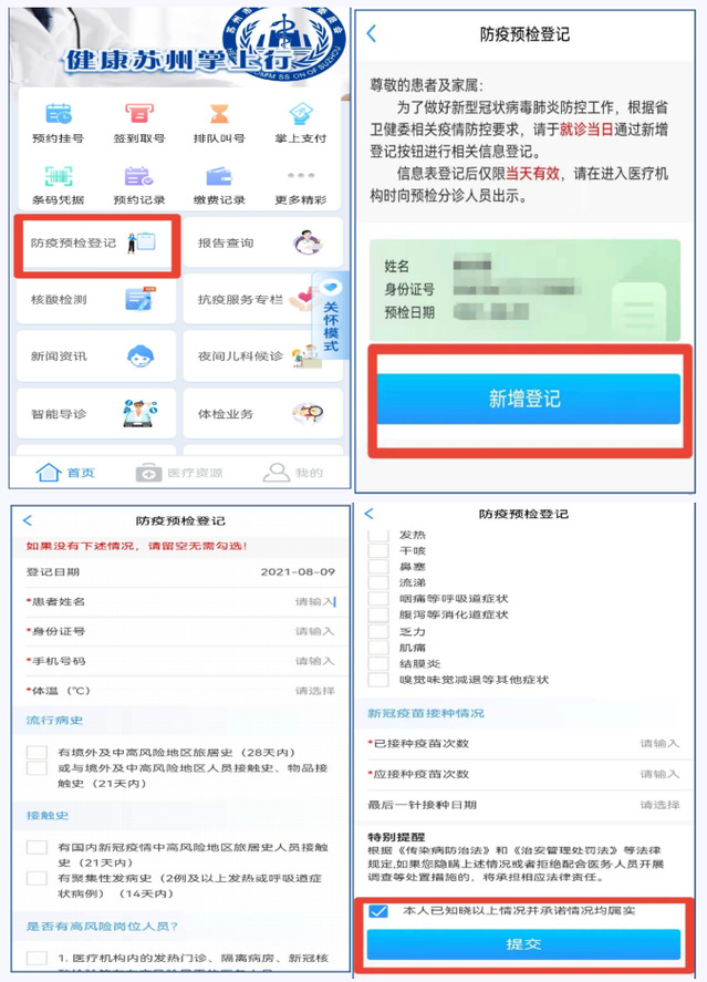1.市民可在就诊当日通过健康苏州掌上行APP、苏州卫生12320 公众号加勒比扑克菜单“新冠专栏”,点击“防疫预检登记”。选择就诊人后,登记防疫预检信息。也可通过苏州卫生 12320公众号加勒比扑克菜单“预约挂号”栏选择“我要预约挂号”,在 弹出的提示框中点击“立即登记”,选择就诊人后,登记防疫预检信息。