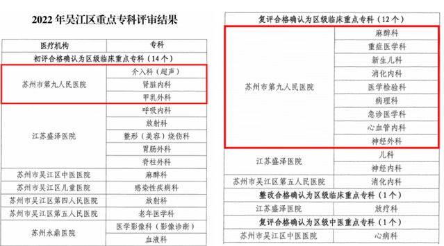 近日,吴江区卫健委公布了2022年度吴江区重点专科名单,苏州九院介入科(超声)、肾脏内科、甲乳外科新确认为吴江区重点专科。麻醉科、重症医学科、新生儿科、消化内科、医学检验科、病理科、急诊医学科、心血管内科、神经外科顺利通过复审,继续确认为区级重点专科。