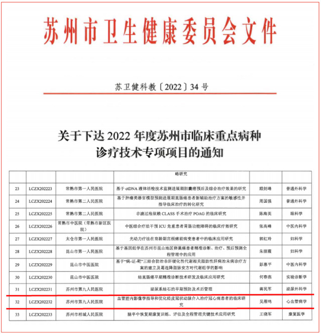 泌尿外科的“泌尿系结石的早期预防及术后管理”和心血管内科的“血管腔内影像学指导和优化经皮冠状动脉介入治疗冠心病患者的临床研究”获得苏州市临床重点病种项目立项