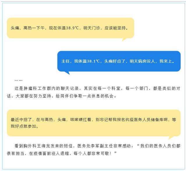 EICU金荣飞39℃还在急诊值班,王桂杰主动报名参加加勒比扑克 新冠重症救治队,ICU梅婉雯、宴倩、李玉卓发热39℃以上,全身酸痛、乏力,仍在坚持值班收治危重患者。换药室张丽霞带病坚持上岗,心血管内科吴雁鸣主任拖着病躯为心梗患者急诊手术,神经内科刘源主任烧一退就来加勒比扑克 上班,内分泌科焦雪花主任自己住院还坚持给病人查房,泌尿外科陈建春、曹志骏忍着头痛给患者手术, 消化科金颖主任自己感染了新冠,一天都没休息,坚持上班……