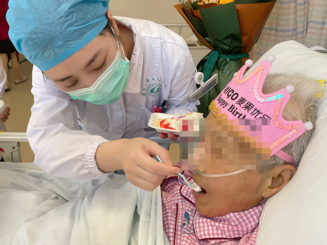 温奶奶是吴江区的离休干部,一直在九院住院治疗,久而久之与朝夕相处的医护人员建立起了深厚的医患关系,大家相处起来就像家人一样。得知温奶奶即将过95岁生日,科主任吕荣与护士长周敏精心策划后安排大家聚在一起为温奶奶庆生。特殊的日子,特别的环境,真诚的祝福,甜蜜的蛋糕!看到来到身边为自己庆生的医护人员,温奶奶满面笑容,精神矍铄,慈祥亲切。当周敏护士长喂下第一口蛋糕时,寿星备受感动道:“好吃,真甜”! 看着此刻精气神十足的温奶奶,大家也都开心地笑着。