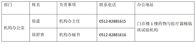 临床试验机构设主任和副主任各一名,分别是沈根海、徐元,下设临床试验机构办公室。机构办公室配备6名专职工作人员负责临床试验管理工作,机构办公室主任徐蓝,机构办公室秘书徐舒青,药物/器械管理员吴小珍、庄月园、石玉涛,资料管理员庄月园、吴小珍、石玉涛,质量控制员宋秋萍、徐舒青、黄明。