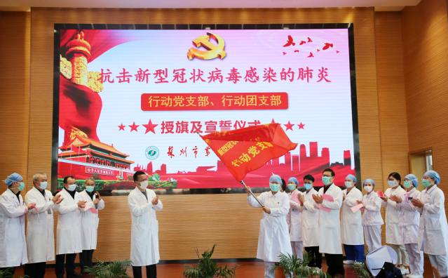 苏州九院李金彪带领在场的抗击新型冠状病毒感染的肺炎行动党支部和行动团支部成员及医护人员志愿者进行庄严宣誓,坚决做到一切听党指挥,召之即来,来之能战,全身心投入抗击疫情的各种工作,不畏惧、不退缩、不计较个人得失,冲锋在前,全力以赴、不辱使命,用实际行动去实现在党旗下的誓言,做一个为维护人民群众的健康无私奉献、敢为人先的九院人,坚决打赢疫情防控阻击战,筑起保护人民群众生命安全的钢铁长城。